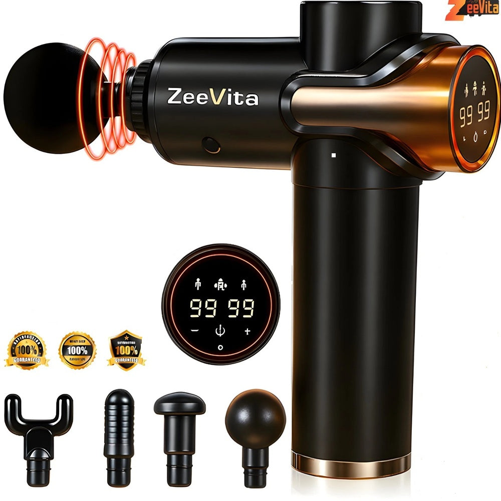 30 ADJUSTABLE SPEED LEVEL - The percussion massager equipped with LCD touch screen showing speed levels and battery display.