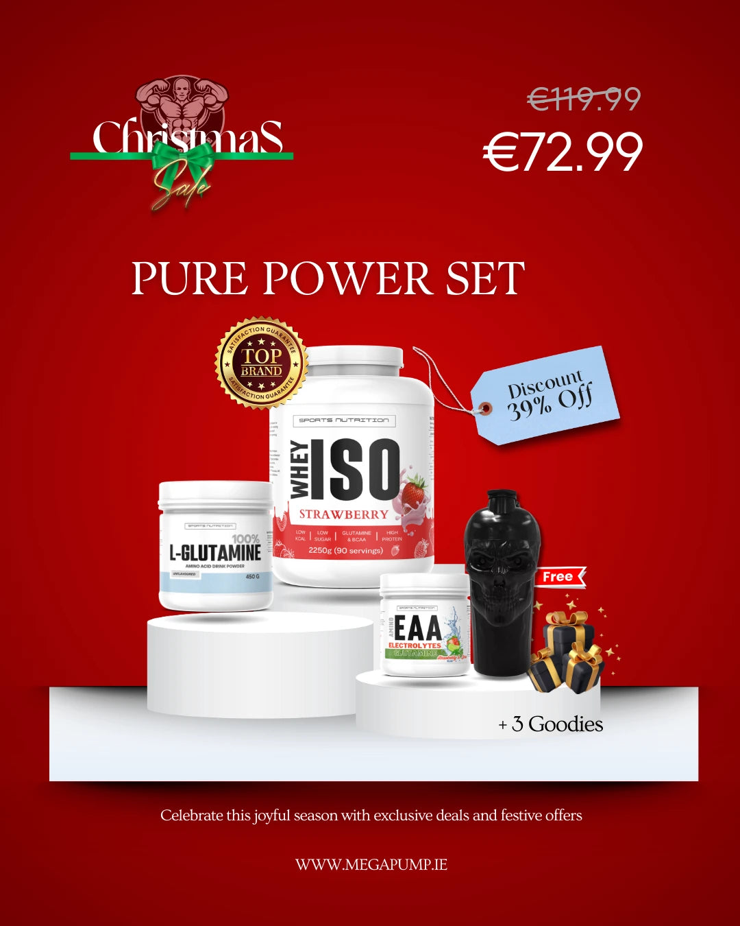 Boost your performance with the Sports Nutrition Premium Pack – Pure Power Set. This high-quality isolate stack includes ISO Whey, EAA, and unflavoured glutamine to support muscle growth, recovery, and endurance. Perfect for athletes seeking pure power and maximum results.