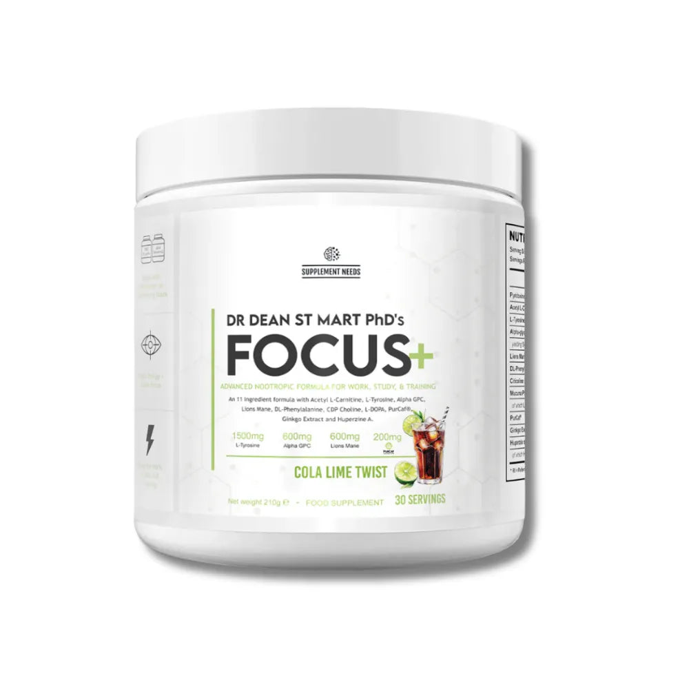Focus+ is a fully transparent, non proprietary, stimulant nootropic product containing 11 ingredients at efficacious doses as part of the Supplement Needs Dean St Mart Health range.
